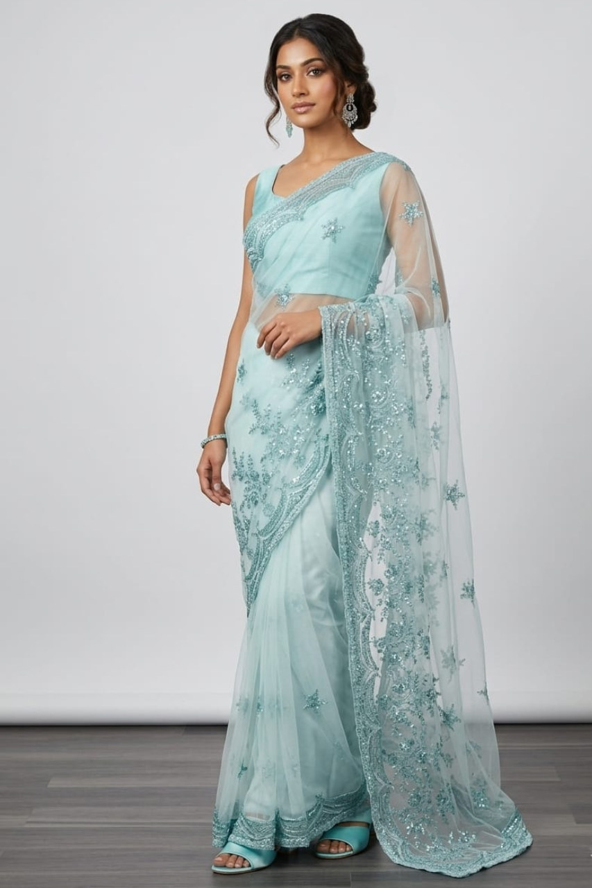Delicate yet daring, this blue net saree with sequins border with embroidery work. It’s light, dreamy, and designed to reflect just the right amount of glam without going overboard. A perfect pick for those who like their festive look with a soft edge and just the right hint of sparkle. This comes with running silk fabric blouse piece.