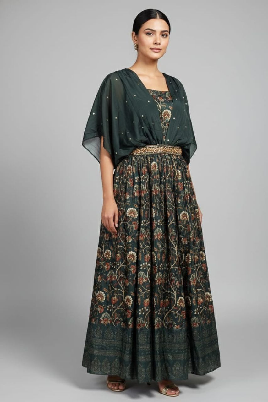 This sophisticated green gown is designed for elegant evening affairs. The green gown features a full floral details all over the body. This comes with belt and have can can.