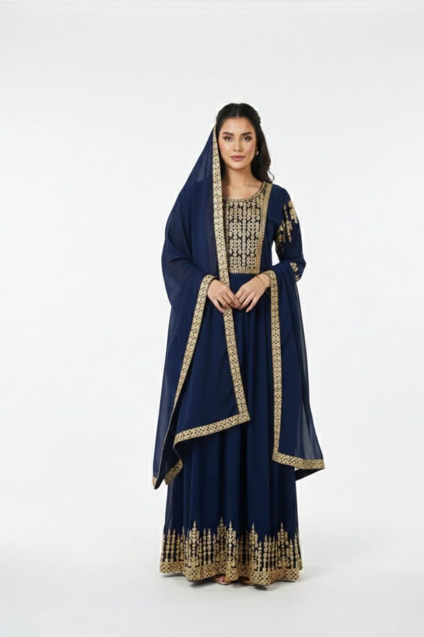 Step into the spotlight with this radiant georgette Anarkali, adorned with sequins work that glimmers beautifully at every turn. The full sleeves and round neckline add a timeless elegance, giving the ensemble a regal, celebration-ready feel. Its fluid, luminous drape paired with the matching dupatta creates a look made for weddings, festive and grand occasions.