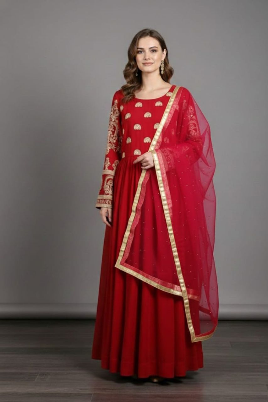 This Red georgette anarkali suit balances lightness with presence. Thread embroidery highlights the flare so it moves beautifully under lights. You feel refined and celebration ready all evening. This comes with can can so it can flare up. This comes along with net dupatta.