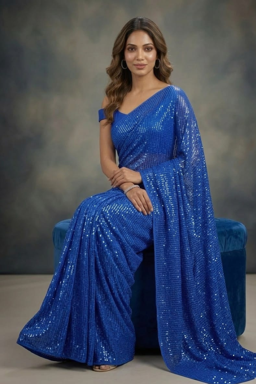 Partywear elegant looking pre pleated ready to wear saree with sequins work. This comes with running plain silk blouse piece. Perfect for cocktail party.